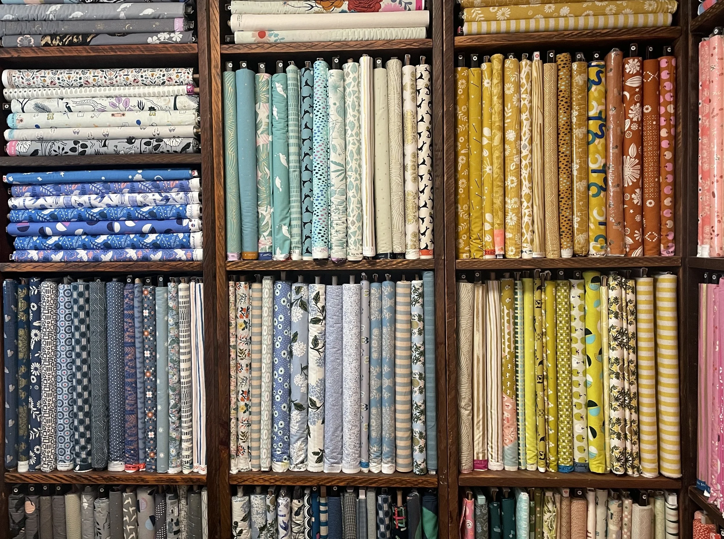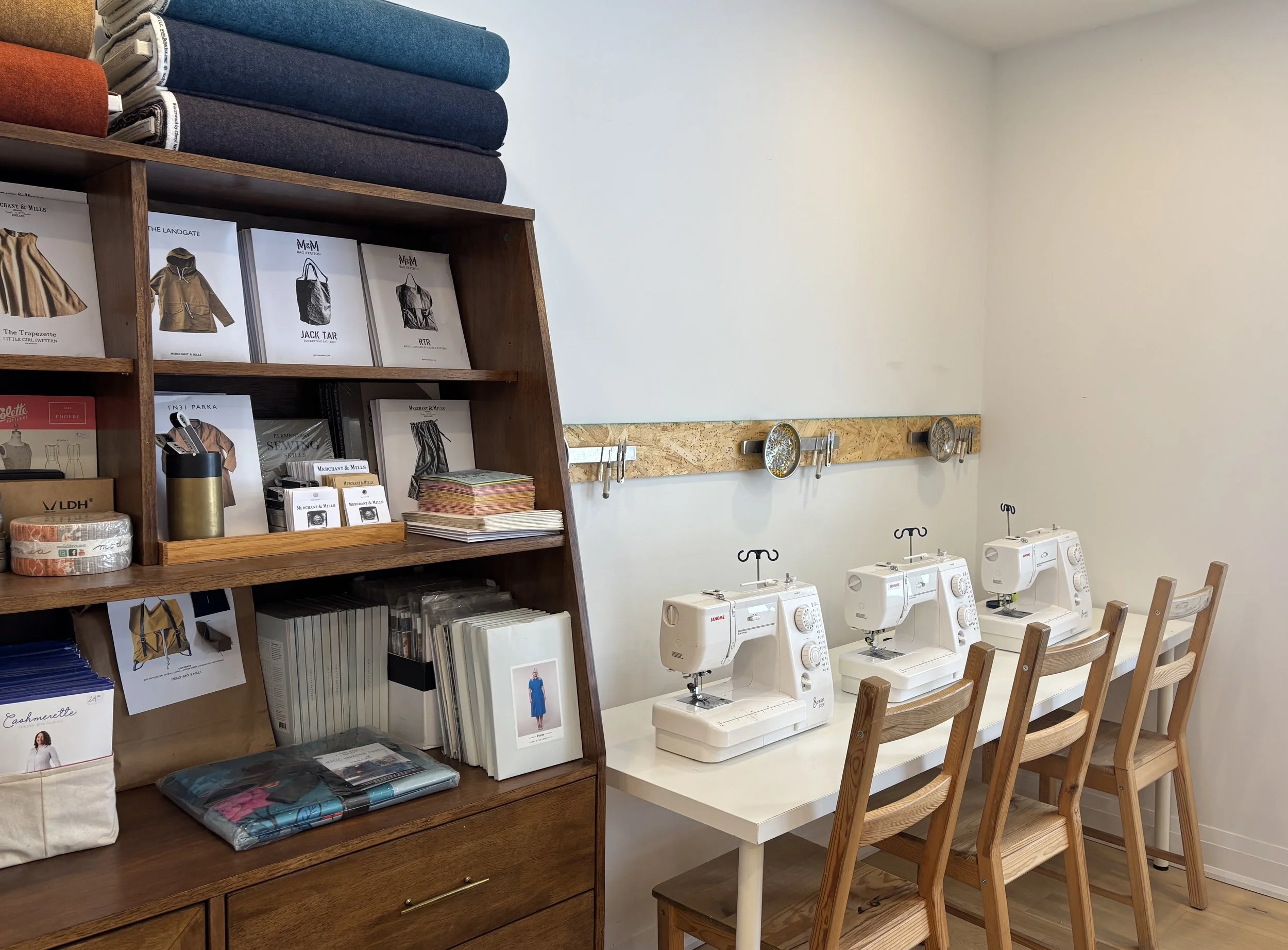 Our teaching studio is located in downtown Collingwood, and offers a bright and well equipped space, complete with all the machines, tools, drafting tables and equipment you'll need to bring your ideas to life. We provide powerful Janome 625e straight stitch machines, XG-43D sergers, Janome coverstitch machines, plus a semi-industrial walking foot machine for making heavy duty bags and gear plus an MQ-1000 quilting machine, as well as a wide range of patterns, fabrics, kits, projects and tools.